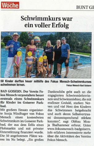 Das beweist, wie wichtig es ist, Kindern das Schwimmen beizubringen. Mit großem Einsatz hat Sonja Windhager von FOKUS Mensch einen kostenfreien Schwimmkurs organisiert, der aus dem Erlös eines Flohmarktes und mit finanziellen Beiträgen von Bernhard Windhager, David Haslauer und der Generali Versicherung finanziert wurde. Alle 50 Plätze waren im Nu belegt, und es war schön anzusehen, mit wieviel Freude und Begeisterung die Kinder mit dabei waren.